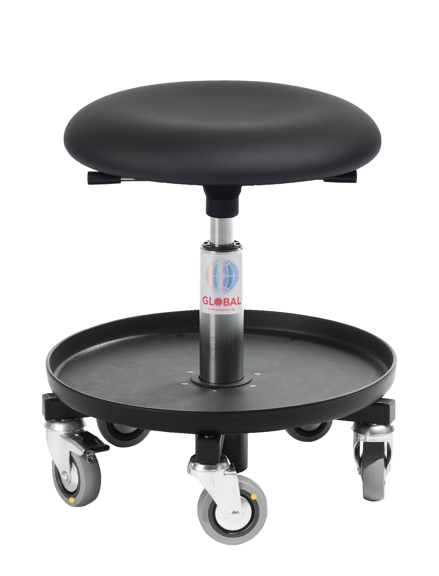 Denne montørstol er med stålfodkryds, værktøjsbakke og letløbende ESD hjul, hvoraf 2 er med bremse.